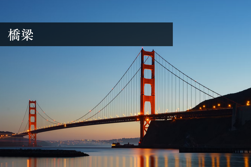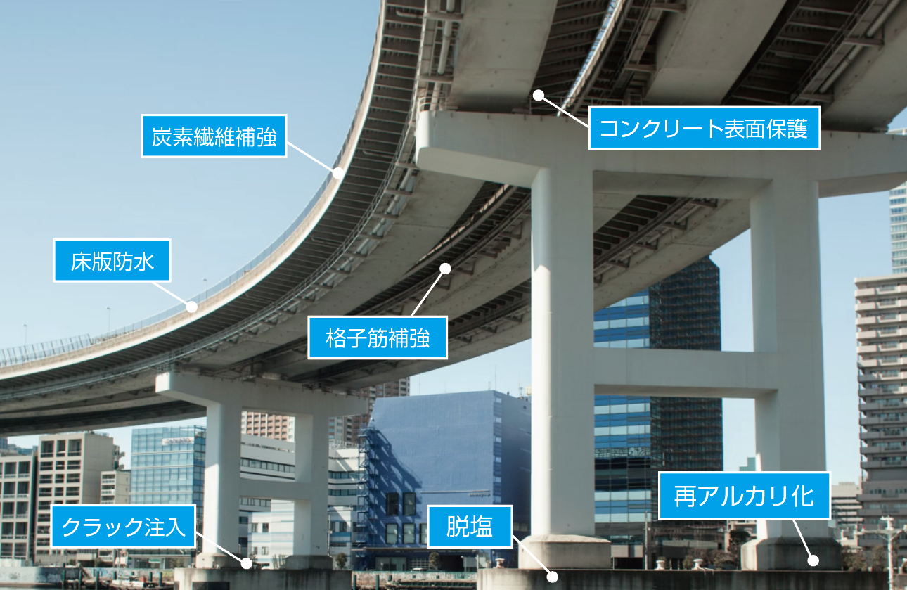 土木構造物補修・土木工事 土木工事なら久保田工芸 土木工事業者をお探しなら、久保田工芸にお任せください。 橋梁・道路・トンネルをはじめ、多種多様な土木建造物の工事が可能です。 土木専門部隊を編成しており、トラブルが無く、確かな技術で施工しております。 特にコンクリートの補修は、試験施工や試験供試体の提供など高い評価をいただいております。 日光や新潟など遠方での工事も発注いただき、出張工事を行うなど、各地から頼りにしていただいております。 多種多様な補修が可能 こちらは橋梁の例ですが、1社で数多くの施工をお任せいただけます。 新たな材料や工法を積極的にとり入れ、技術力の向上に力を尽くしておりますので、安心してお任せください。 全国ナンバーワンの実績 電気化学的脱塩工法とコンクリート再アルカリ化は、施工実績/㎡が全国ナンバーワンとなり、技術と対応に高い評価を頂いております。 気化学的脱塩工法 電気化学的脱塩工法は、もともと海外で開発された塩害対策で、数多くの橋梁や海沿いの道路等で施工されています。 日本では1992年に初めて適用され、久保田工芸でもいち早く取り入れました。 塩害の原因となるコンクリート中の塩分を電気泳動により除去します。 脱塩工法の紹介 再アルカリ化 通電によりアルカリ性が低下したコンクリートのアルカリ度を回復させ、コンクリート自身が持つ鋼材の防食効果を向上させる工事です。 新潟の親不知海岸高架橋をはじめ、重要文化財、銀行ビル、バイパスなどでコンクリート再アルカリ化を施工しております。 再アルカリ化の紹介 土木建造物補修は久保田工芸にお任せください 多種多様な土木建造物補修が可能です。 拠点は神奈川県横浜市に拠点がありますが、全国出張可能です。 クラック注入や防水工事など、補修に関わる工事も詳しくご案内しているので、ご覧ください。 可能な範囲で実績も公開しておりますので、ご覧いただければ幸いです。 土木建造物補修実績